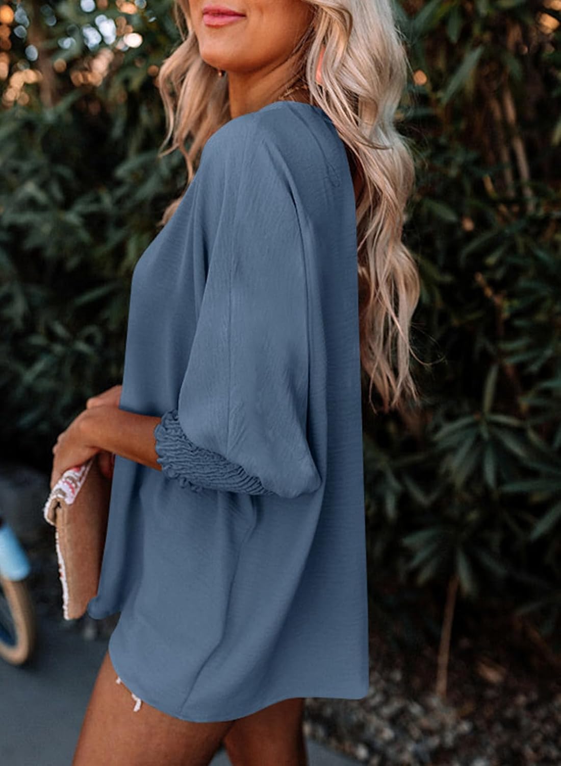 - Features: Casual scoop neck,loose fit flowy style,3/4 smock sleeve blouses,classic solid color design long shirts.